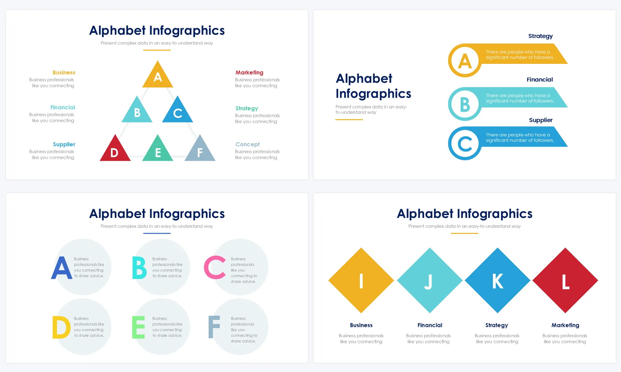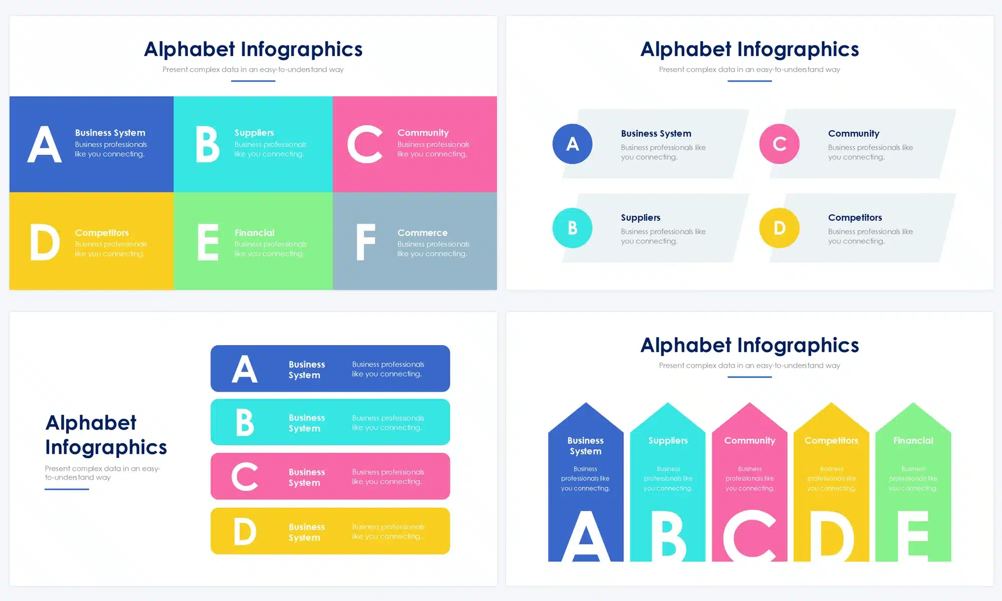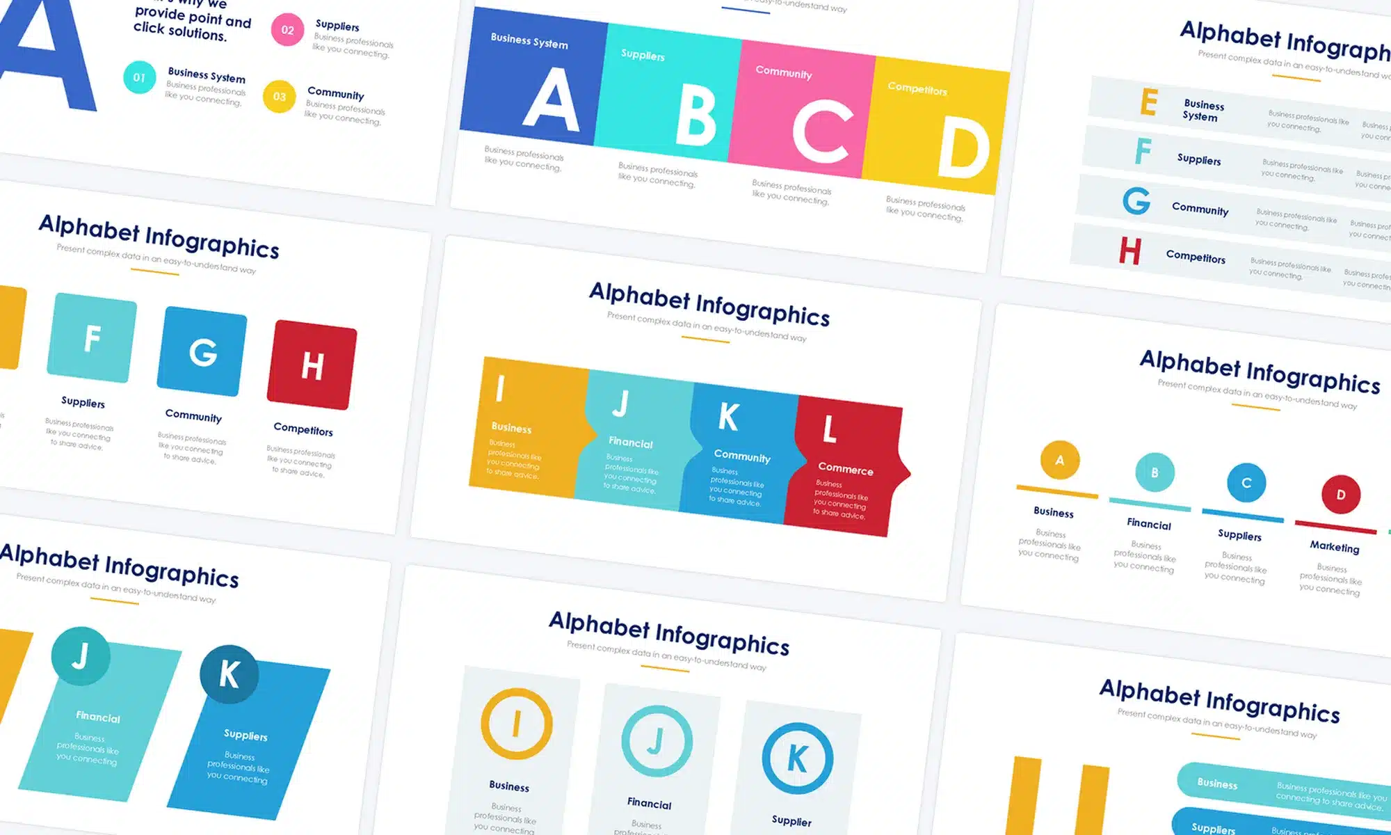 Engage and educate with visually appealing Alphabet Slides. Perfect for educational settings or creative presentations, these slides feature alphabets creatively designed to grab attention while teaching or highlighting essential points. Use them to make learning interactive, fun, and memorable.