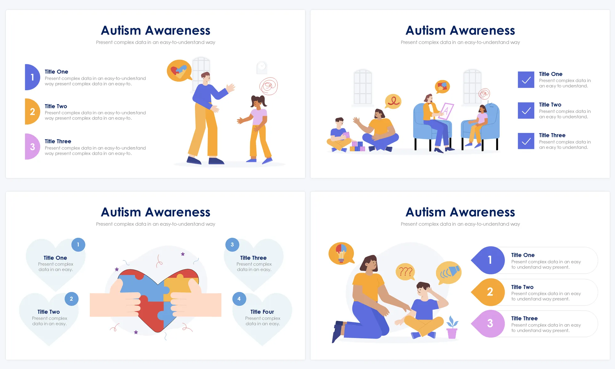 Promote understanding and awareness of autism with informative and supportive Autism Awareness Slides. Educate audiences about autism spectrum disorders, challenges faced, and supportive strategies. Use these slides to advocate for inclusivity and acceptance within communities and organizations.