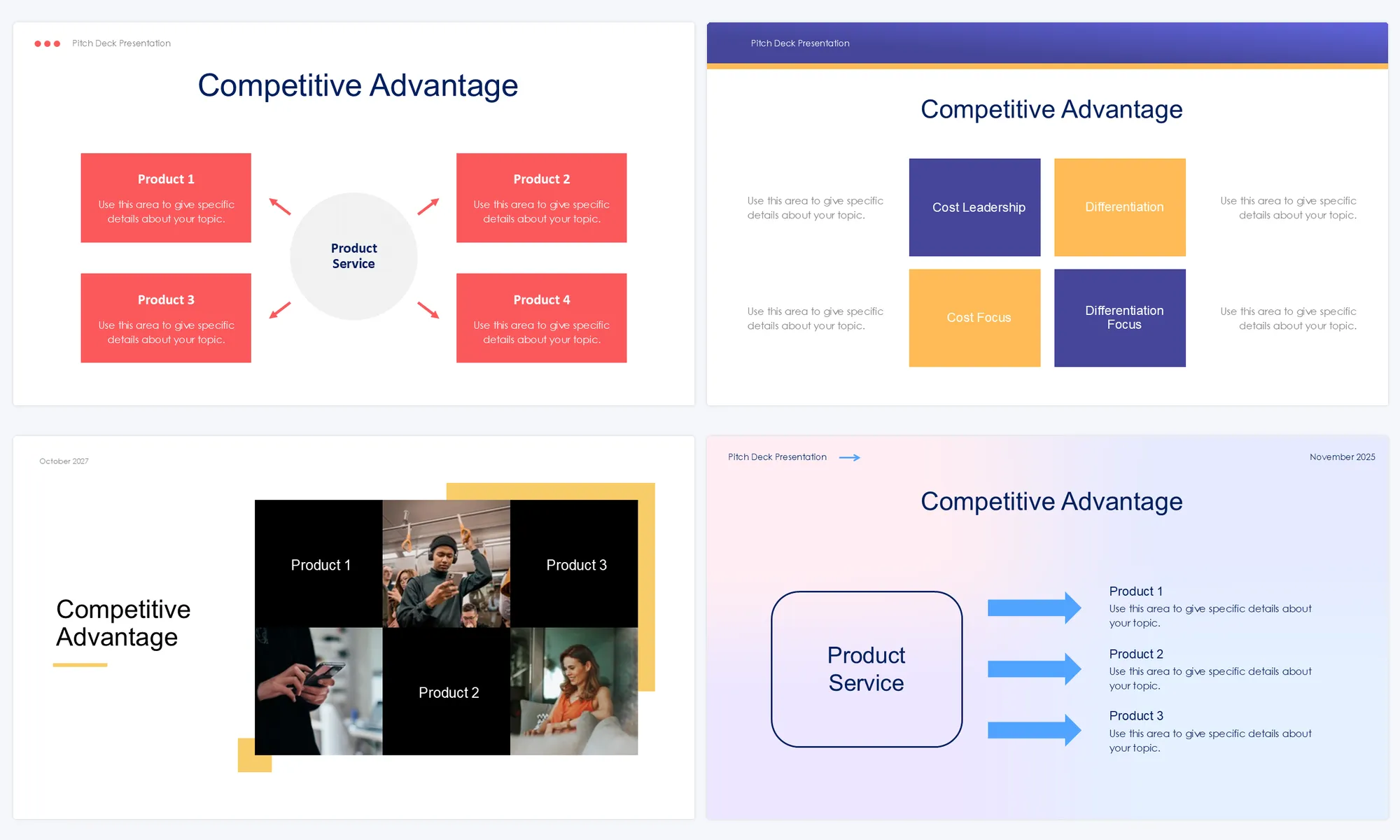 Uncover strategies for gaining a competitive edge with Competitive Advantage Slides. Showcase unique selling propositions, market positioning, or value propositions using informative visuals and explanatory content. These slides aid in identifying and leveraging competitive advantages within businesses or presentations.