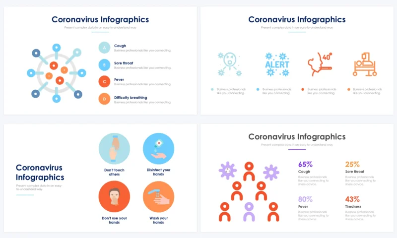 Educate and inform about COVID-19 related topics using Coronavirus Slides. Present statistics, prevention measures, vaccination information, or pandemic impact analysis with informative visuals and explanatory content. These slides serve healthcare professionals, educators, or organizations advocating for pandemic awareness.