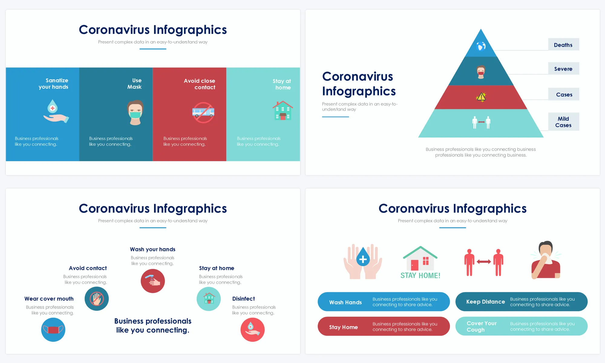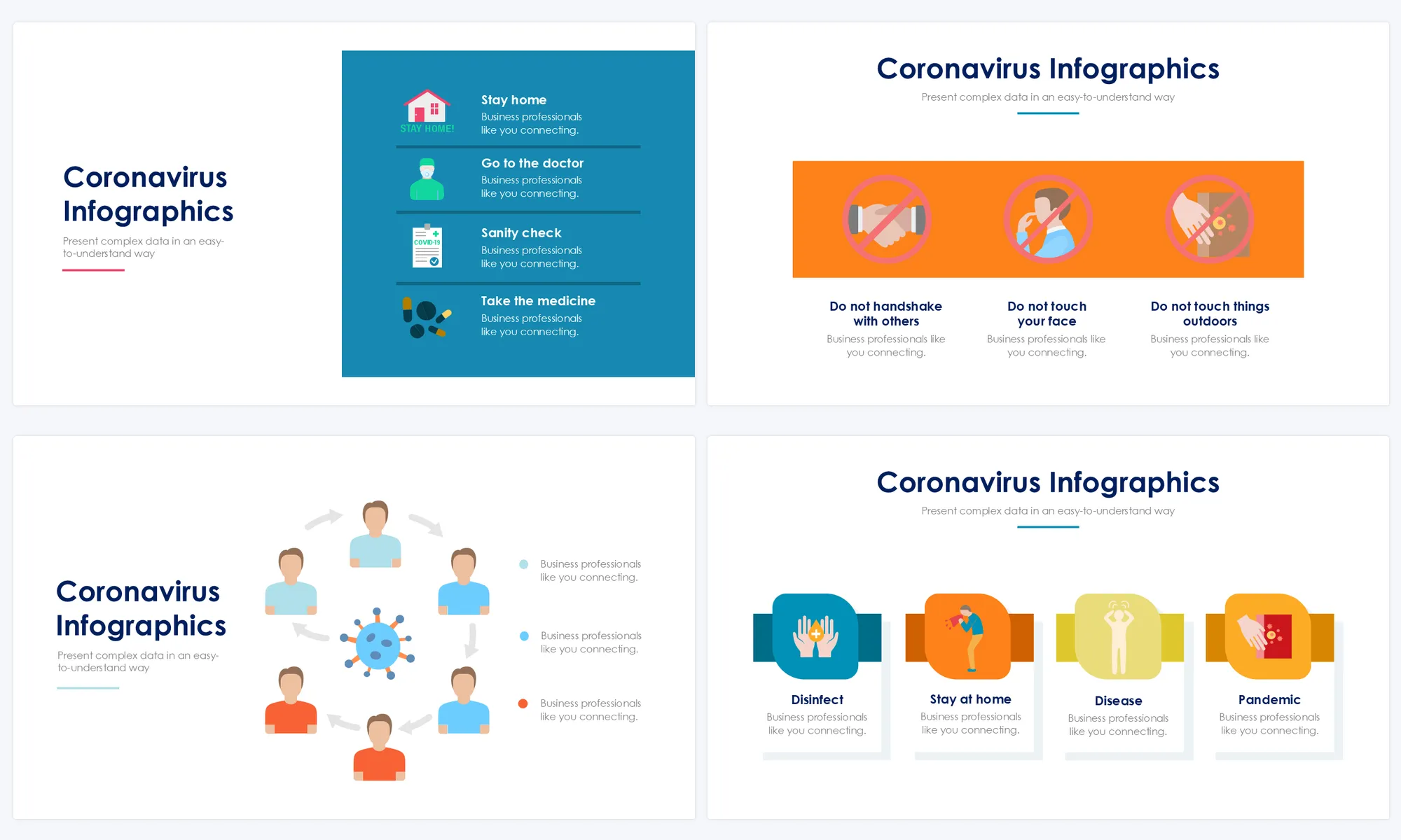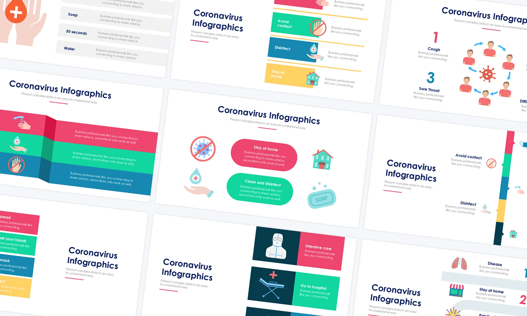 Educate and inform about COVID-19 related topics using Coronavirus Slides. Present statistics, prevention measures, vaccination information, or pandemic impact analysis with informative visuals and explanatory content. These slides serve healthcare professionals, educators, or organizations advocating for pandemic awareness.