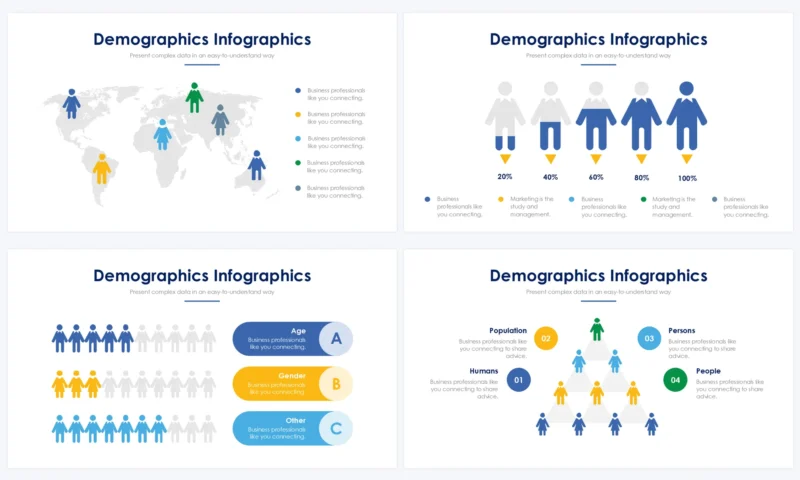 Analyze demographic data, trends, or population characteristics with Demographic Slides. Present age, gender, ethnicity, geographic distribution, or socioeconomic statistics using informative visuals and explanatory content. These slides aid in understanding target audiences or market segments.