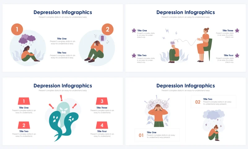 Raise awareness and provide insights into depression-related topics with Depression Slides. Present information on symptoms, treatments, coping mechanisms, or mental health support using informative visuals and explanatory content. These slides serve as educational resources for mental health professionals or awareness campaigns.