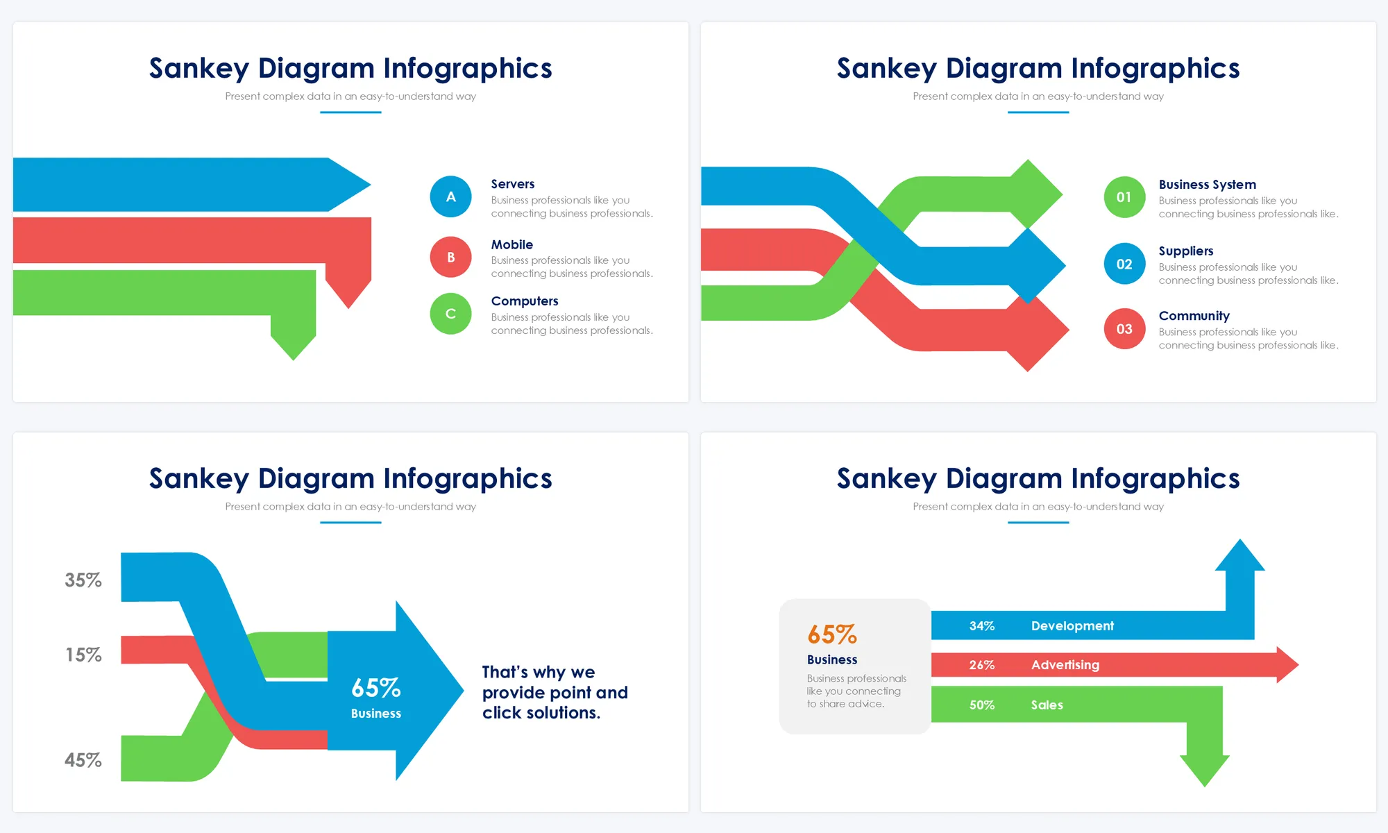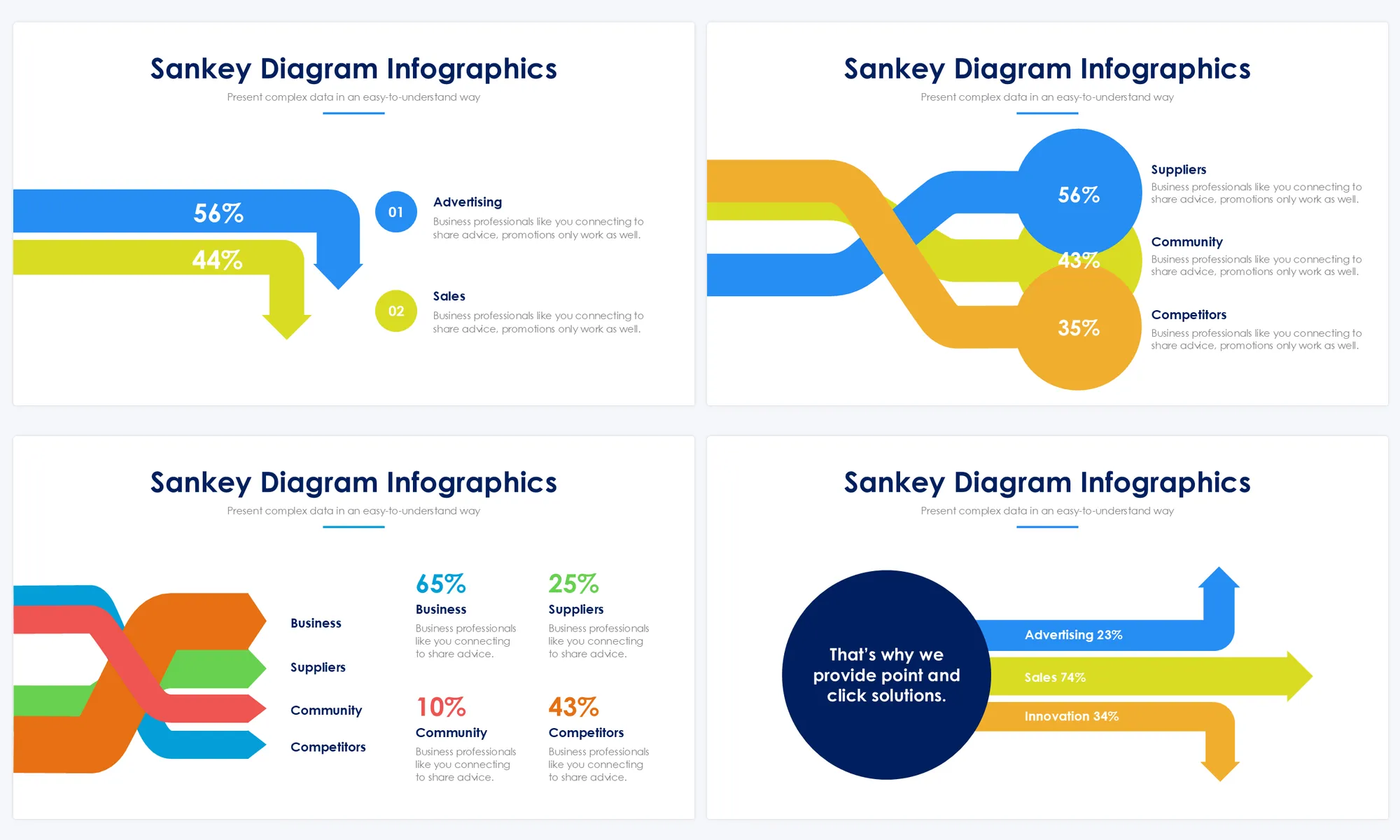 Visualize flow and distribution patterns of energy, resources, or data with Sankey Diagram Slides. Present Sankey diagrams depicting flows, connections, or proportions in a system, illustrating energy transfers, material flows, or resource allocations using visuals and explanatory content. These slides aid in presenting complex data relationships.