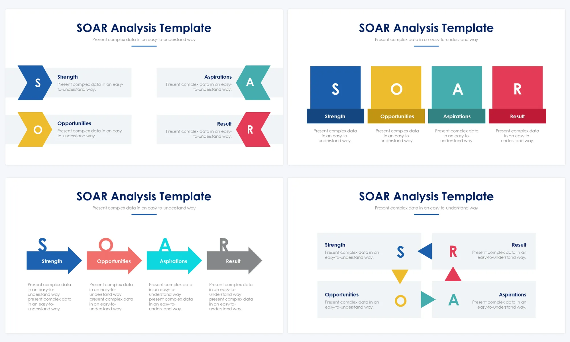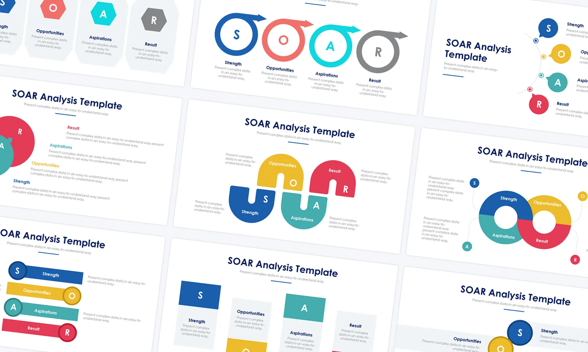 Explore Strengths, Opportunities, Aspirations, and Results (SOAR) frameworks with SOAR Analysis Slides. Present strategic planning models, positive psychology approaches, or organizational development methods using visuals and explanatory content. These slides aid in fostering positive organizational change and goal-setting.