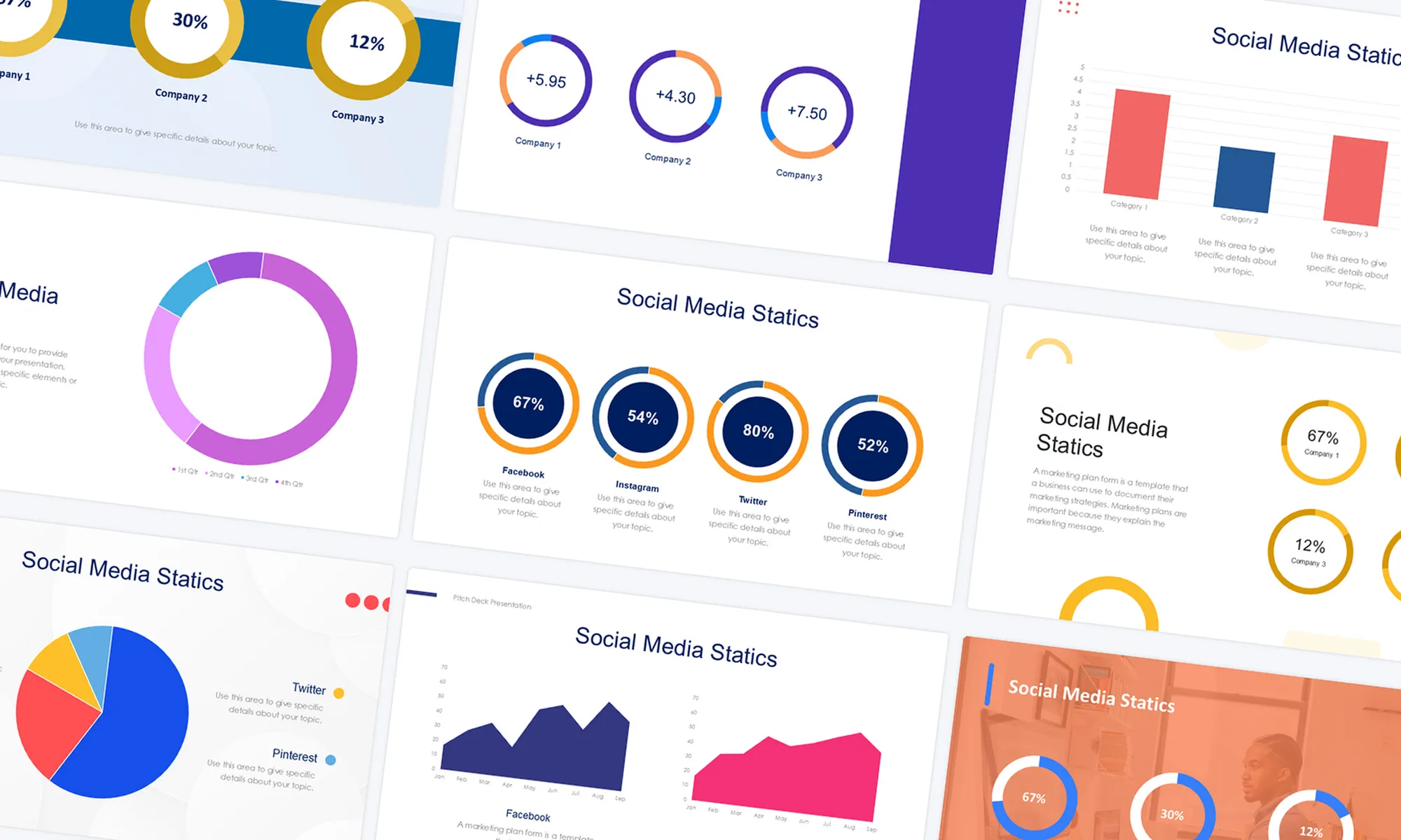 Present statistical data, trends, or analytics related to social media platforms with Social Media Statics Slides. Showcase graphs, statistics, or insights on user engagement, demographics, platform growth, or content performance using visuals and explanatory content. These slides aid in illustrating and analyzing social media metrics.