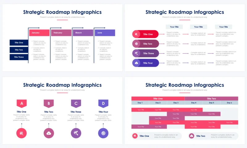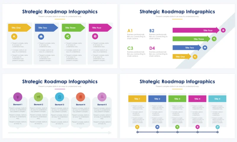 Outline strategic plans, initiatives, or business roadmaps with Strategic Roadmap Slides. Present roadmap diagrams, strategic initiatives, key objectives, or business strategies using visuals and explanatory content. These slides aid in communicating long-term visions and strategic goals.