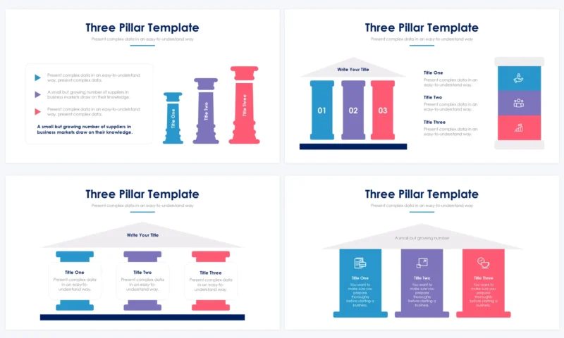 Highlight three key elements, principles, or strategies with Three Pillar Slides. Present frameworks, strategies, or concepts based on three core principles or pillars using visuals and explanatory content. These slides aid in emphasizing key elements or strategies.