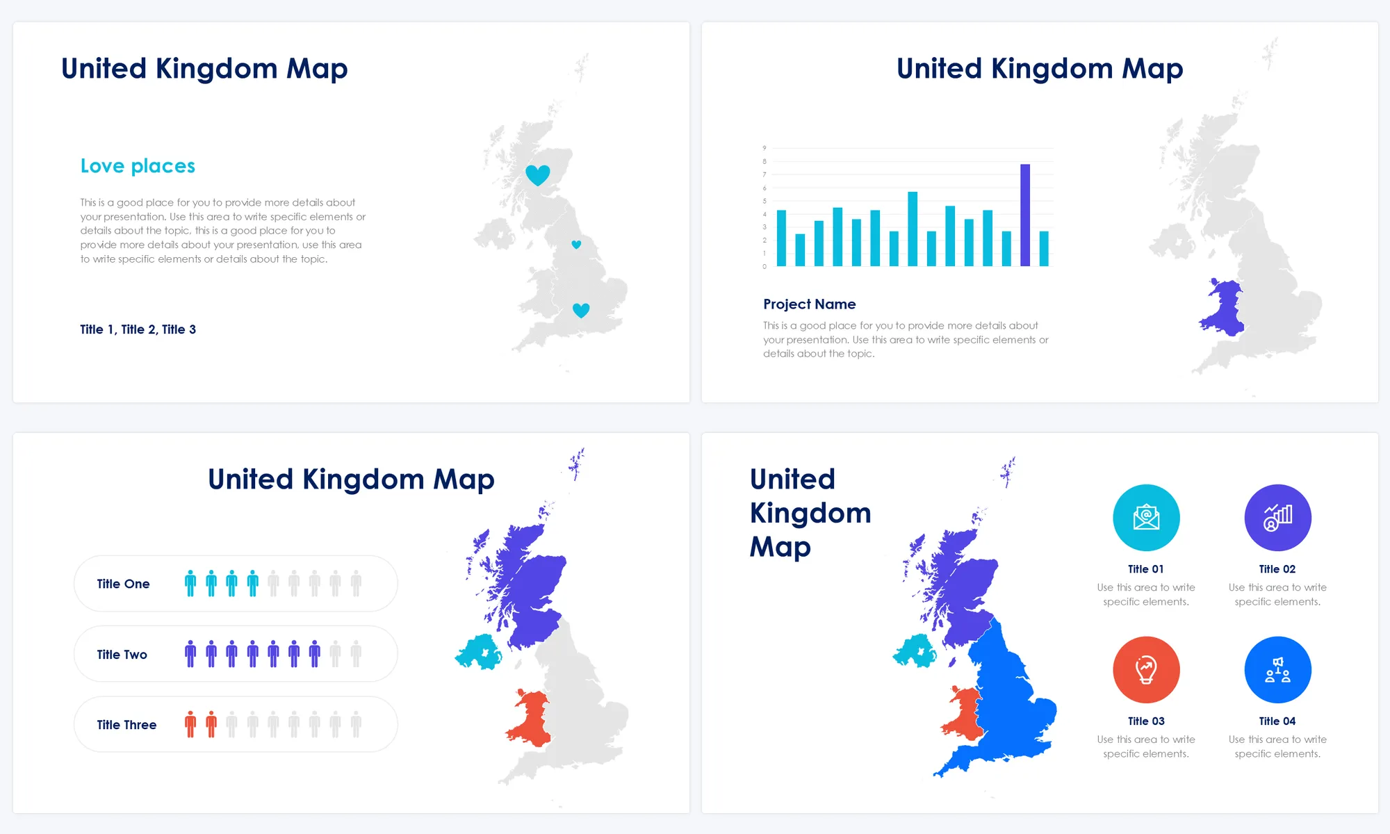 Explore the geography, regions, or statistical aspects of the United Kingdom with United Kingdom Map Slides. Showcase detailed maps illustrating countries, regions, landmarks, demographics, or statistical information related to the UK. These slides cater to presentations focused on UK studies, market analysis, or geographical representations.
