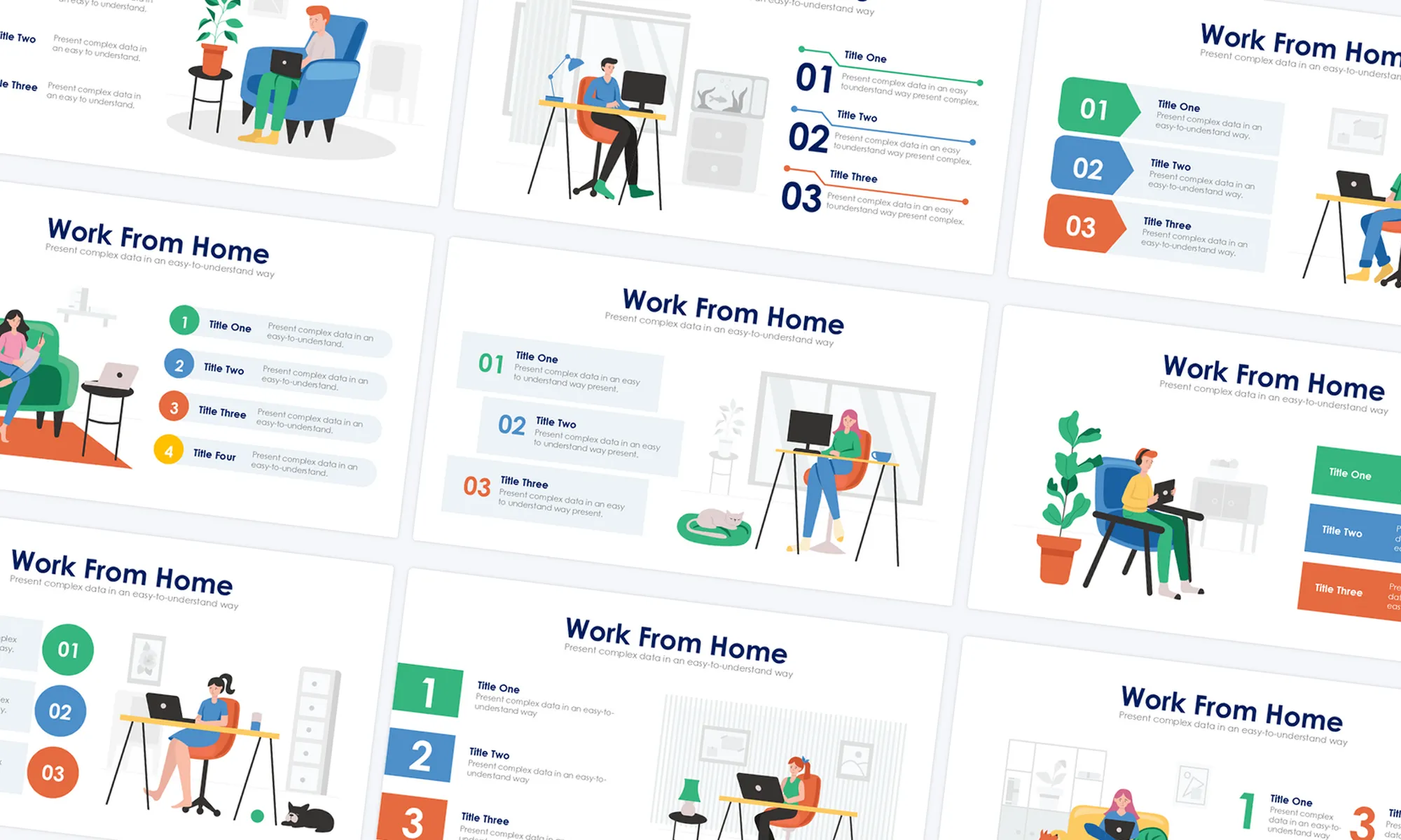 Discuss remote work setups, telecommuting strategies, or virtual office guidelines with Work From Home Slides. Present information on remote work policies, best practices, virtual collaboration tools, or telecommuting tips using visuals and explanatory content. These slides cater to remote workers, managers, or businesses adopting work-from-home setups.
